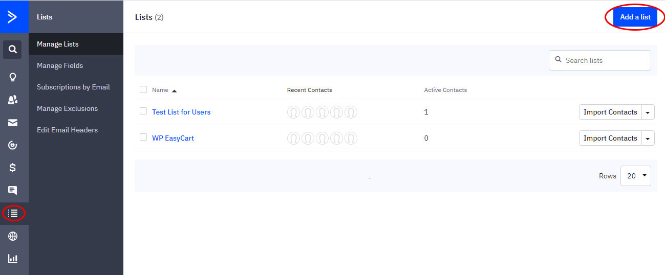 4. Next, you must create an ActiveCampaign List in order to save your subscribers to. Without a list, they don’t know where to store your subscribers. Navigate back to your ActiveCampaign dashboard and select ‘Lists‘ on the left menu and create new. Give it a new name and that’s it!