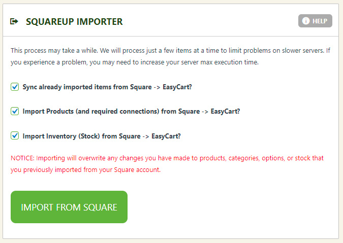 Special Note: If you already synced the products one time, you may select ‘Sync already imported items from Square -> EasyCart’ and it will then simply update the products, making sure not to duplicate existing products. This makes a nice option to sync each week. If you re-run the importer, it will bring in the products and duplicate them otherwise.