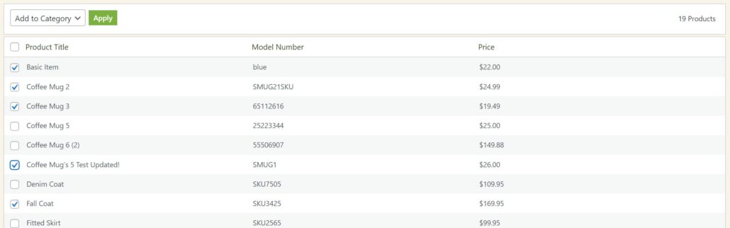 Now that you are viewing a full list of products, you must use the checkboxes to select the products you want to add, then use the Bulk Actions to add them to the category in bulk