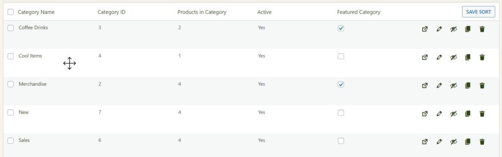 To quickly set the category sort order, when you have 500 or less categories, you may drag and drop them when on the WP EasyCart -> Products -> Categories panel. When hovering over the row, click and drag the item to the correct spot. Once done BE SURE TO CLICK SAVE SORT!