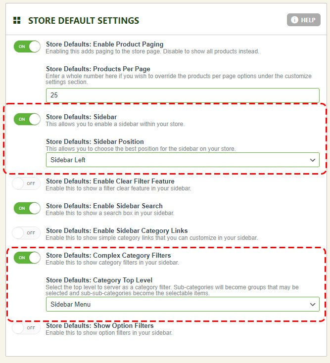 Last, we need to simply tell EasyCart which category will represent our entire complex category filter tree structure. This is a simple setting in our WP EasyCart -> Settings -> Products panel. Here we must turn ON the store sidebar. Then we can engage the Complex Category Filters system. Choose the correct Top Level Category we created previously that represents our entire tree structure and your set to go.