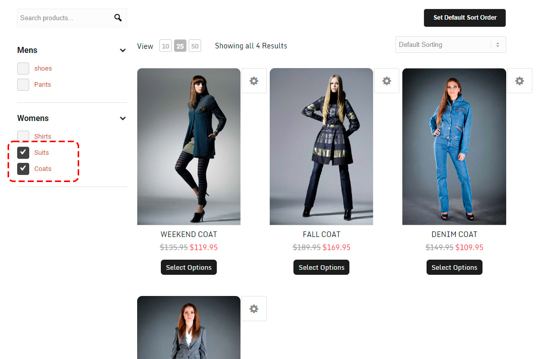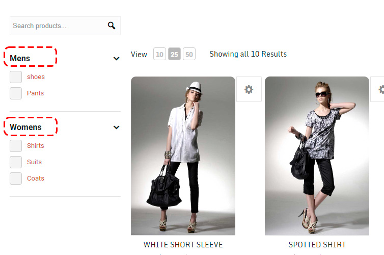 Last, we create our third level category filters which will be represented by checkboxes under each heading. These third level categories should have the products that are under them applied. This is the ‘filter‘ system that these categories represent. In this example, under Women’s we have ‘Shirts, Suites, and Coats’ that represent each third level category filter. Users can enable/disable multiple categories this way for viewing and essentially filter all the items under that heading.