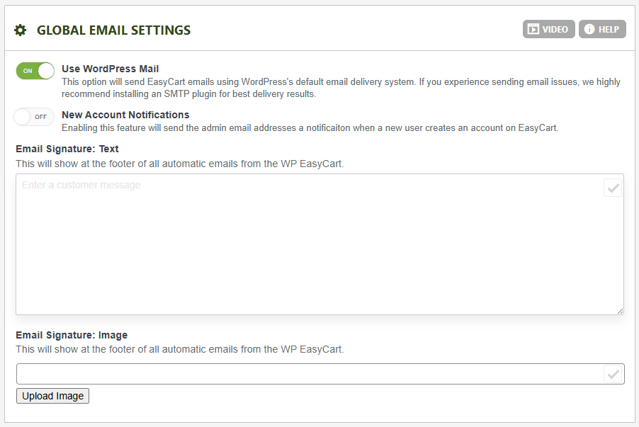 WP EasyCart email settings allow for flexible email setup and configuration to make sure your customers account and order emails are sent and received. EasyCart offers a native emailing system but can easily be switched to WordPress for sending email. Should you still have any issue with email sending, we recommend you use WordPress to send email and setup an SMTP plugin for authenticated email. It is a bit more steps to install and configure SMTP, but because it’s authenticated, it can be much more reliable.