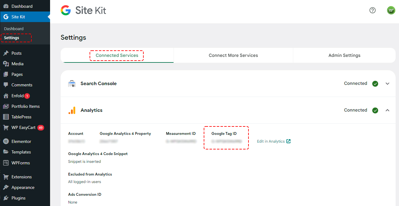 Next, we will visit Google analytics and find our GA4 Measurement ID or Google Tag ID to copy into WP EasyCart. This will allow transactional analytic data to be passed after a user purchases from your shopping cart. Shopping totals and product information is passed and put into Google Analytics and you can thus find conversions and where users may have come from for purchases. The easiest way to find this ID is in your WordPress -> Google Site Kit -> Settings and click on the ‘Analytics’ section. Your Google Tag ID is listed here.