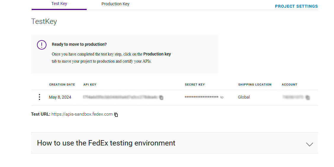 Test Keys are then provided and you may use these in WP EasyCart. Within the WP EasyCart Settings -> Shipping Settings for fedex, you may slide the Test Mode to ON for these API Key and Secret to work. Be sure to copy/paste the credentials correctly and look for any extra spaces before or after when you enter the values.