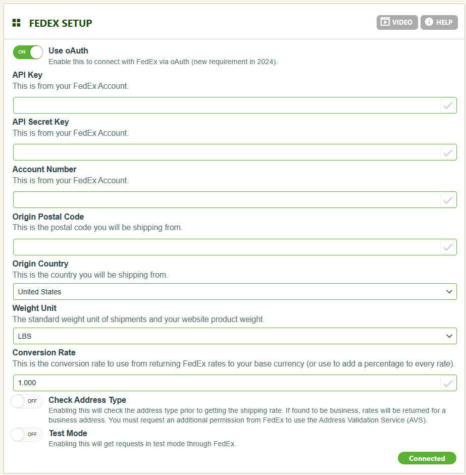 That’s it, you should have your oAuth connection completed and the API Key, API Secret Key, and Account number should be filled in. Enter your origin postal code, country, and other pertinent details below and it should show a green ‘Connected‘ at the bottom right corner. If you see a red ‘Error‘ then you may want to double check spaces before or after your keys and/or create new ones if needed. At this point, you may visit WP EasyCart -> Shipping Rates and be sure to engage ‘Live Rates’ and setup any FedEx rates you wish to use.