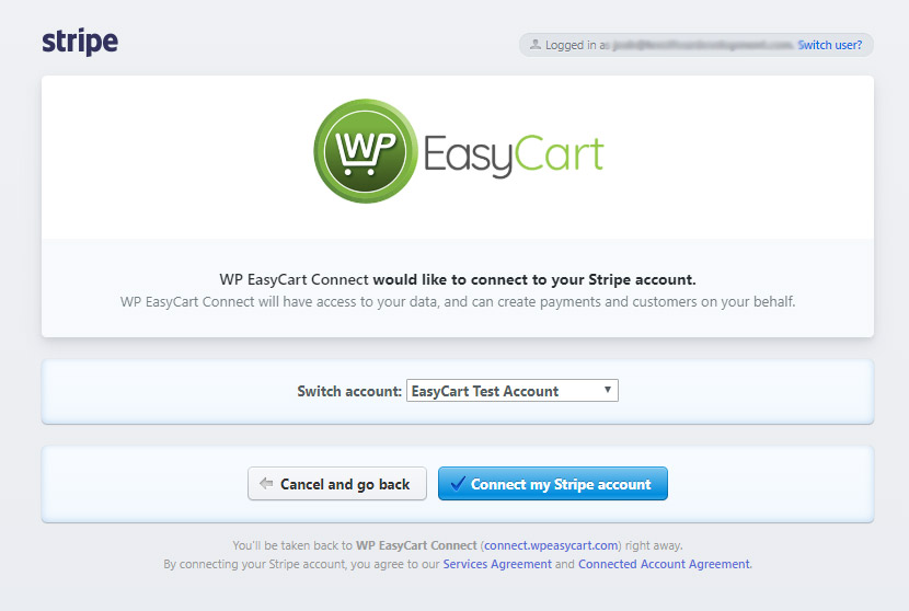 Stripe will ask you to login, and pick which account to connect with, simply select your account and you are now connected.