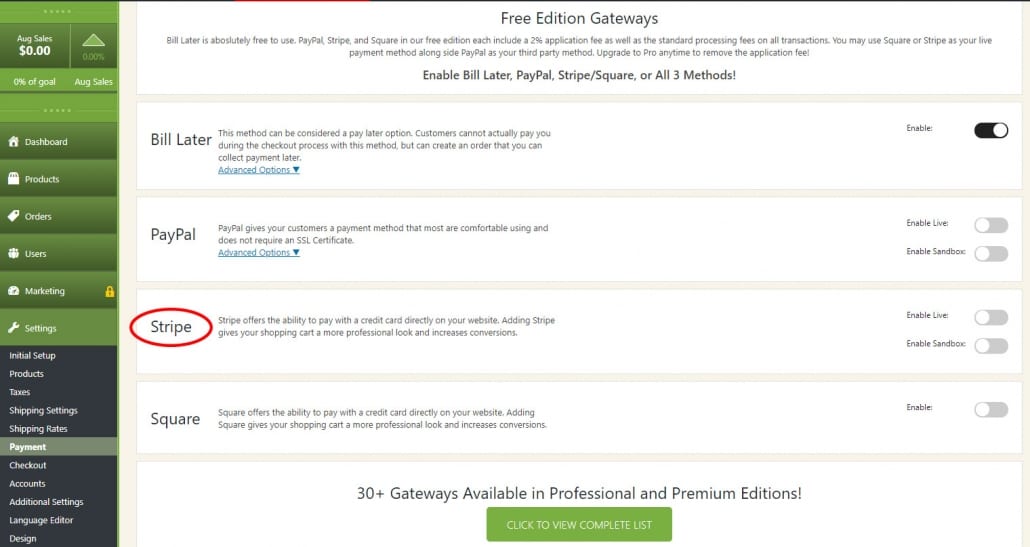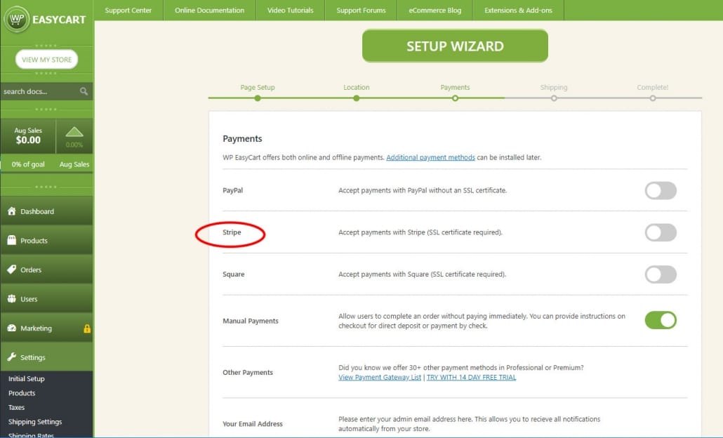 To connect Stripe in our Free edition only takes a few steps. You can enable it via our wizard while setting up, or you can enable it via our WP EasyCart -> Settings -> Payment panel.