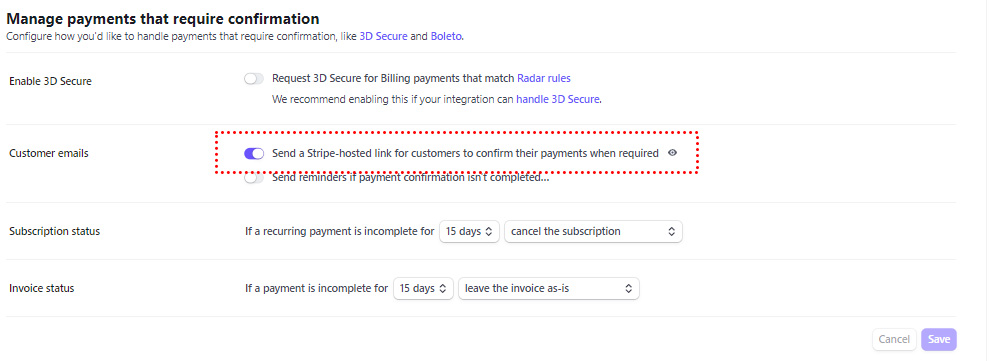 You will need to Enable the Customer Emails -> Send a Stripe-hosted link for cardholders to authenticate when required. This step is required in order to allow 3D secure to work with all areas of EasyCart and its subscription system with Stripe.