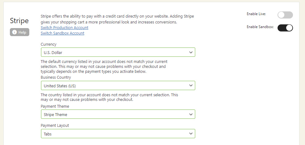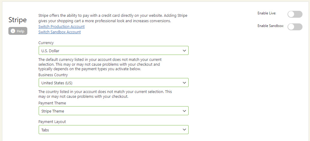 Here we Enable Stripe in EasyCart: Go to WP EasyCart -> Settings -> Payment panel. Simply use the sliders to connect to Stripe Live or Stripe Sandbox.