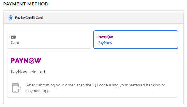 Now when customers go to checkout, they are given the choice to use Stripe for credit card processing, or you will also see the PayNow option if the order and parameters meet the requirements.