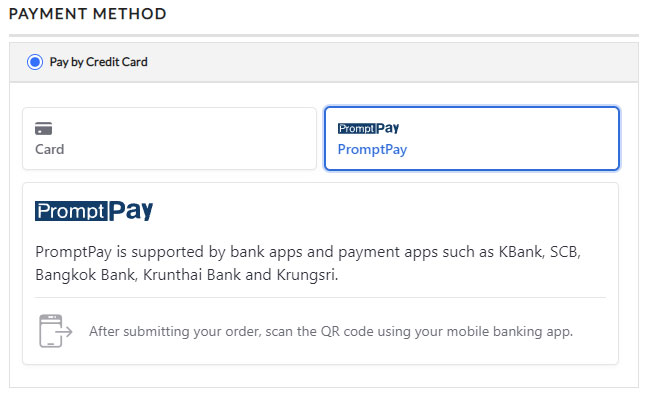 Now when customers go to checkout, they are given the choice to use Stripe for credit card processing, or you will also see the PromptPay option if the order and parameters meet the requirements.