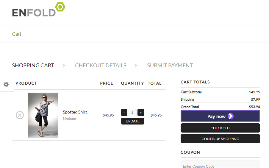 Once you have verified and enabled Apple Pay through Stripe and EasyCart, users are greeted with extra checkout buttons IF they come from select devices. In this example, you can see an extra purple ‘Pay Now’ button for my chrome browser. Users on Apple devices with Apple Pay will be able to see their specific button and checkout becomes a one-click process!