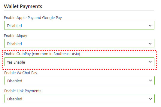 To Enable GrabPay on Stripe: Visit Stripe -> Settings -> Payment Methods -> Enable GrabPay