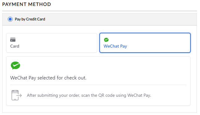 At checkout you will then have access to pay with WeChat along with regular credit card processing.