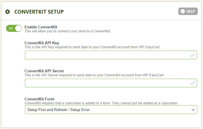5. Once you establish the connection and save your API keys, go ahead and refresh the panel and it will show you the forms from your ConvertKit account. You must select a form, which is essentially what group do you want your customers to go into on the ConvertKit side. It really doesn’t matter since we use our own collection form here in EasyCart. Any user checking out can ‘subscribe to newsletter’ and will go over as well as order prodcuts.