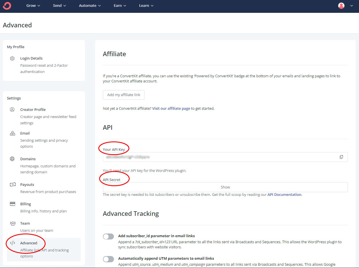 4. Here you will find your API Key and API Secret. You will copy/paste these into the EasyCart Settings -> Third Party -> ConvertKit Setup panel.
