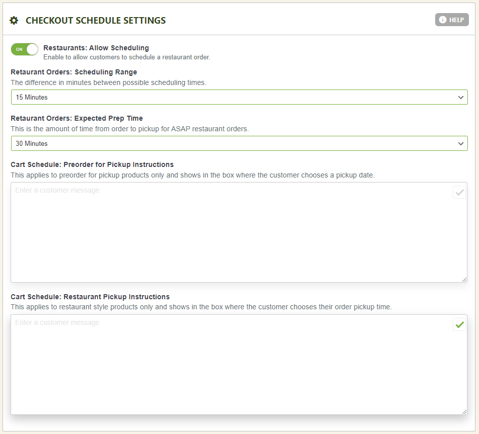 Once you establish a base store schedule, it’s time to setup the checkout. During a regular store checkout on your website, users will be given the option to schedule a pickup time that day for restaurant orders or a pickup time for preorders at a later date. Go to Settings -> Checkout panel and you can engage scheduling here. Notice you can set the scheduling range for restaurant orders (15 minutes in this example) and prep time (30 minutes in this example) as well as establish custom messages/instructions.