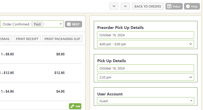 Within each order, you will also notice either the Pickup Date or Restaurant Time the user entered. In this example, we show both, but you will normally see one or the other and also edit them if necessary.