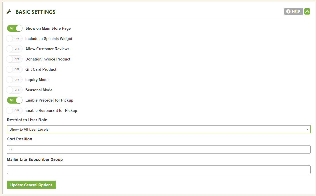 - Enable products either for preorder or for restaurant pickup. Product -> Basic Settings. Each individual item can be enabled either for preorder OR for daily pickup scheduling.