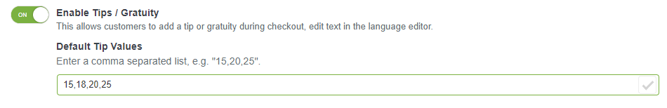An additional option that can be useful for restaurant type business is to engage the easycart tip system. Go to Settings -> Checkout and enable the Tips / Gratuity section. It’s important that you also provide defaults here such as 10, 15, 20, 25 all separated by a comma. These allow users to select tips and also enter custom tips if they wish.
