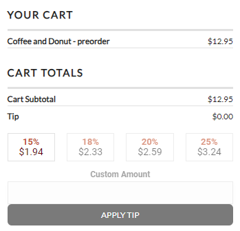 During checkout, users will be present with an option to add an additional tip/gratuity which is customary in this industry. Notice the default values are pre-calculated as well as a custom entry amount is available.