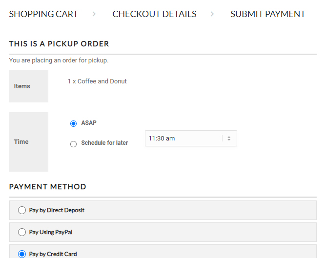 During checkout a restaurant order will see the following in their checkout payment page for scheduling. Notice there are 2 options. ASAP means they will pickup as soon as possible, but the time frame they will see will show a time based on your checkout setting prep time. The Schedule for Later option is going to show future times and blocks, again based on your schedule, where users can pickup that day.