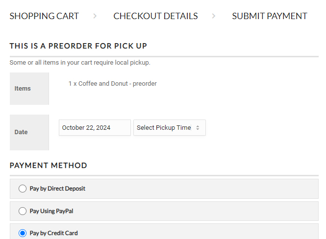 During checkout a preorder user will see the following in their checkout payment page for scheduling. Notice they can select a future date AND pickup time all according to your store schedule and hours.