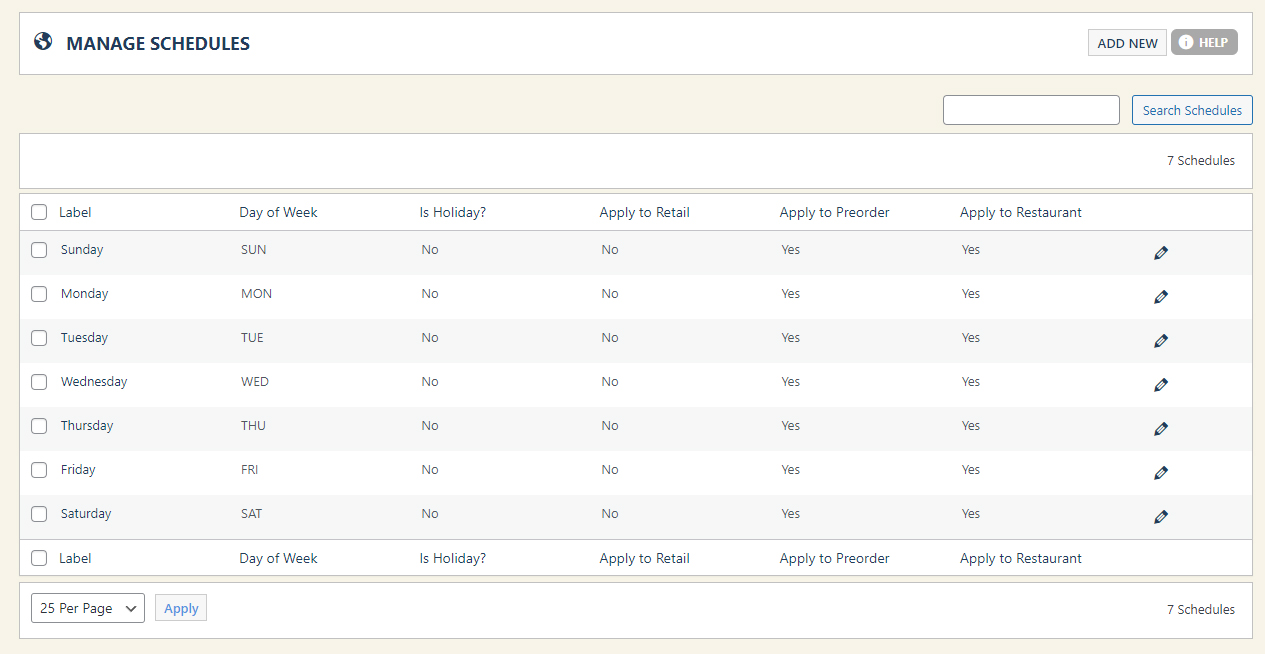 To get started, we want to establish and setup a base store schedule. The core 7 days of the week you can establish a base schedule here in our Settings -> Store Schedule for this task. Click the pencil icon to adjust settings OR you can click ‘Add New’ here and create your own holiday and special exemptions.