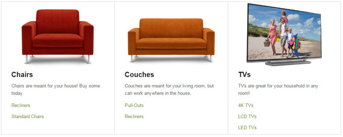 This shortcode allows you to show all featured categories OR pick a parent category and show that categories children. This shortcode works best if you add a description and image to the featured or children categories that will be displayed and works best if you have 3 layers of categories. For example, you have a category Household Items, and inside of that you have Couches, Chairs, and TVs. Inside Couches you have Pull-Out Couches, Recliner Couches, etc.. This will display as follows in the image below.