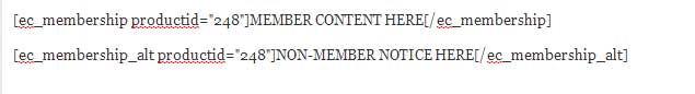 Use this shortcode to wrap membership content that will only be available to customers with a puchase of a particular product or those who have active subscriptions to a recurring billing product. Set this shortcode up by first selecting a product or products required to access the page. Next, edit the content inside the ec_membership tags as the content that will be shown to members. Finally, edit the alternate content to provide non-members information on how they can purchase your membership content and what they will be receiving.