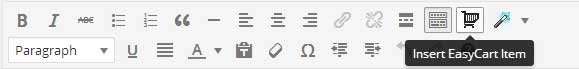 EasyCart offers a wide selection of shortcodes which can easily be added on any page through our shortcode editor. All you need to do is click the tiny cart icon in the toolbar of your page editor (image below).