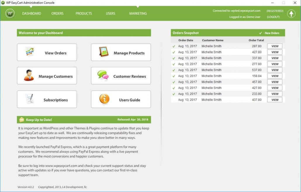 Once logged in and connected, you have access to a variety of administrative tasks that you can perform without logging into WordPress itself. Most customers use this to view orders quickly, print receipts, and update order status all from an application rather than a web based app.