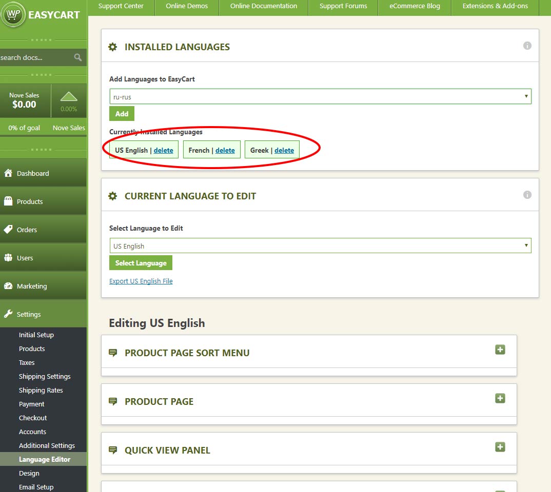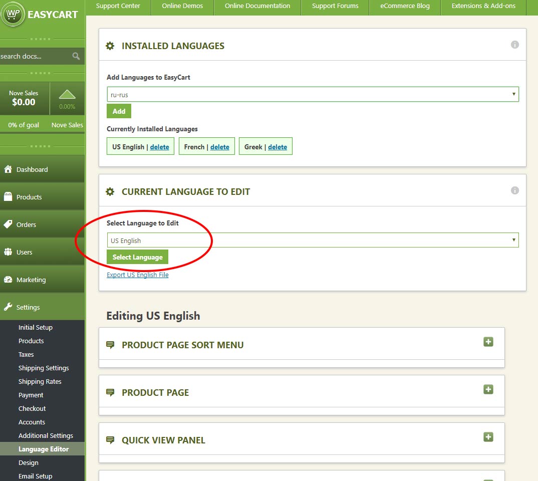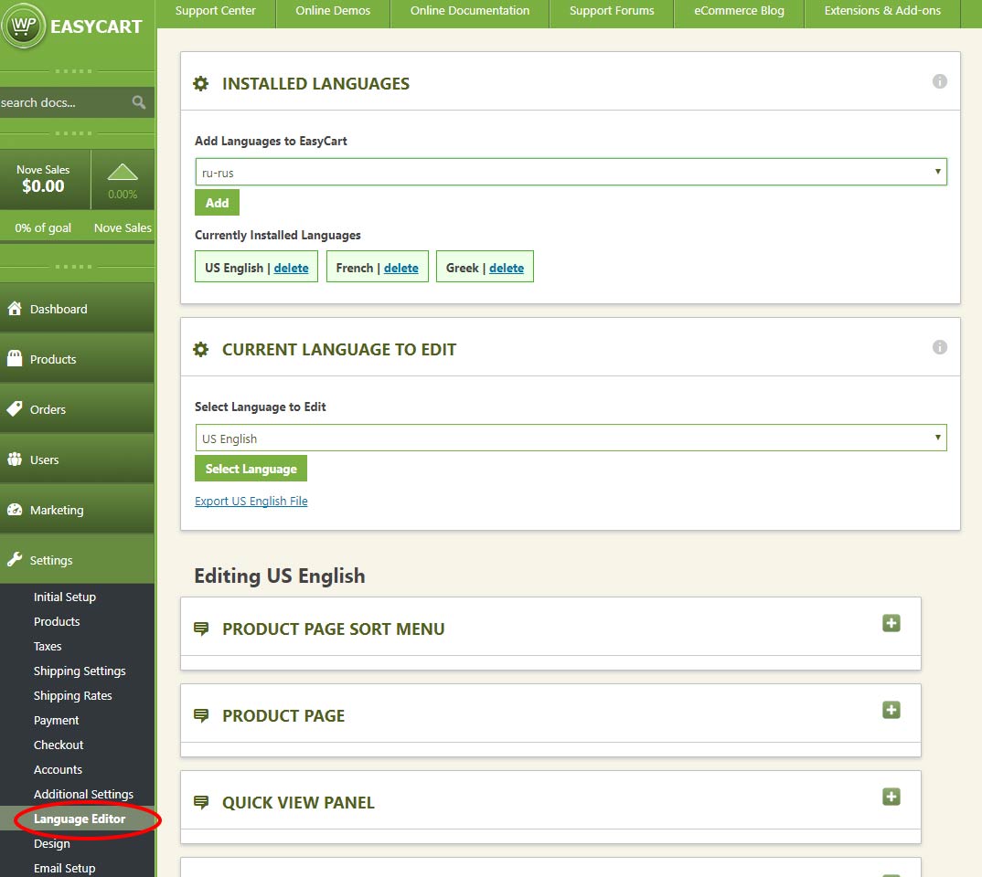 1. Ensure language files exist for the WP EasyCart by visiting your WP EasyCart -> Settings -> Language Editor. Read below if you need to add a language file to fit your requirements.