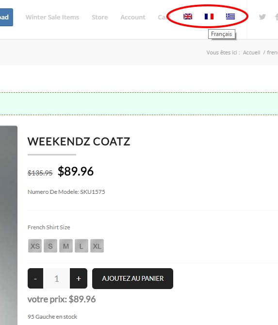 In this example, we have English, French, and Greek flags from WPML to switch language, and you notice we are on french and see the french title of the product, french model number, and french add to cart button.