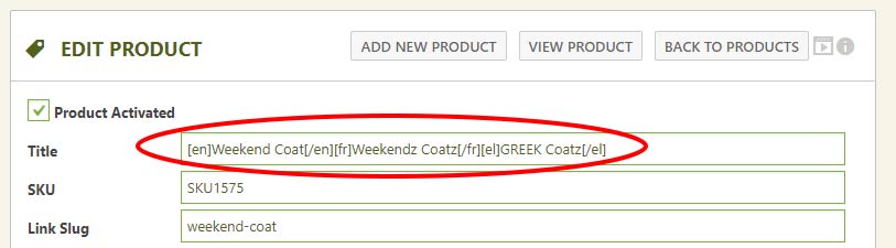 9. Translate Your Products: Throughout the product setups, you can force a translation of any text by entering a translation of each. For example, if you want a product title to be different for English and German, enter [EN]English Title[/EN][DE]German Title[/DE]. The store will translate based on the WPML language selected.