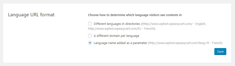 5. Be sure settings in WPML are correct. There are a lot of variables and settings in WPML, and this guide recommends you use basic installation of plugin. We always ensure that you have the URL linking for WPML set to use URL linking variable method. If you utilize other methods, EasyCart may not recognize those.