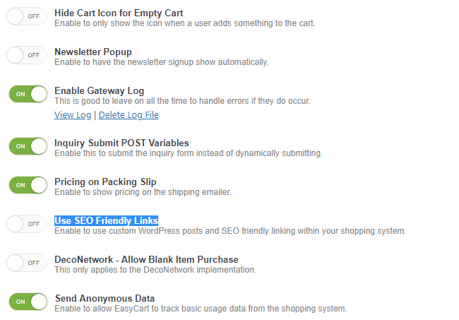 8. Turn OFF SEO Friendly Links: We must go to the settings -> additional settings panel and now turn OFF the SEO friendly links so that we utilize URL variables instead for pages and product displays.