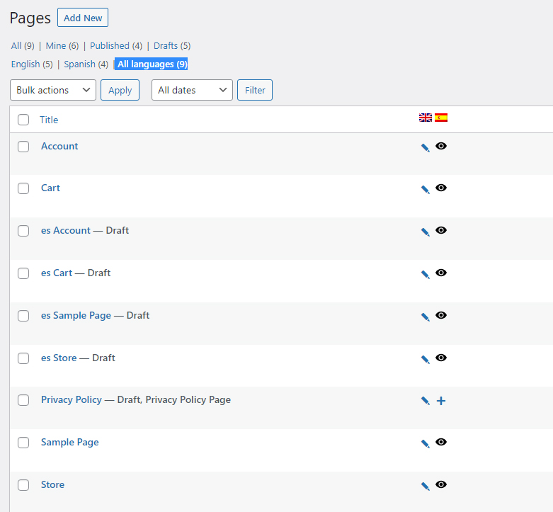 6. Add a “Store”, “Account”, and “Cart” page for each WPML language. You should visit your pages section in wordpress and notice you can view all language pages and there should be a page for each store, cart, account present for each language. In this example below, notice we have english and spanish versions of those pages.